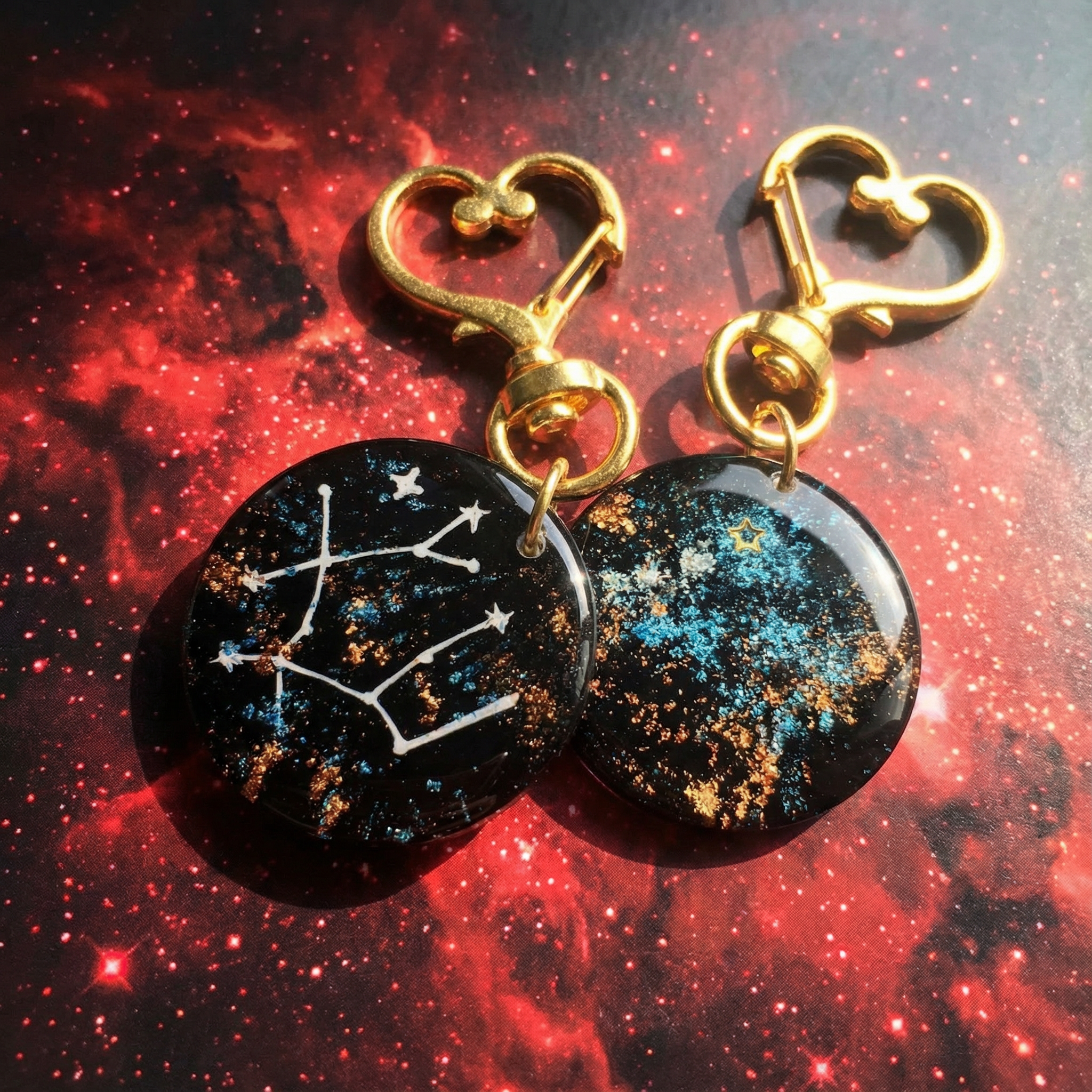 Each piece is crafted as a miniature galaxy, featuring delicately illustrated zodiac constellations set against deep cosmic tones of midnight black, starlit blue, and golden nebula dust.
