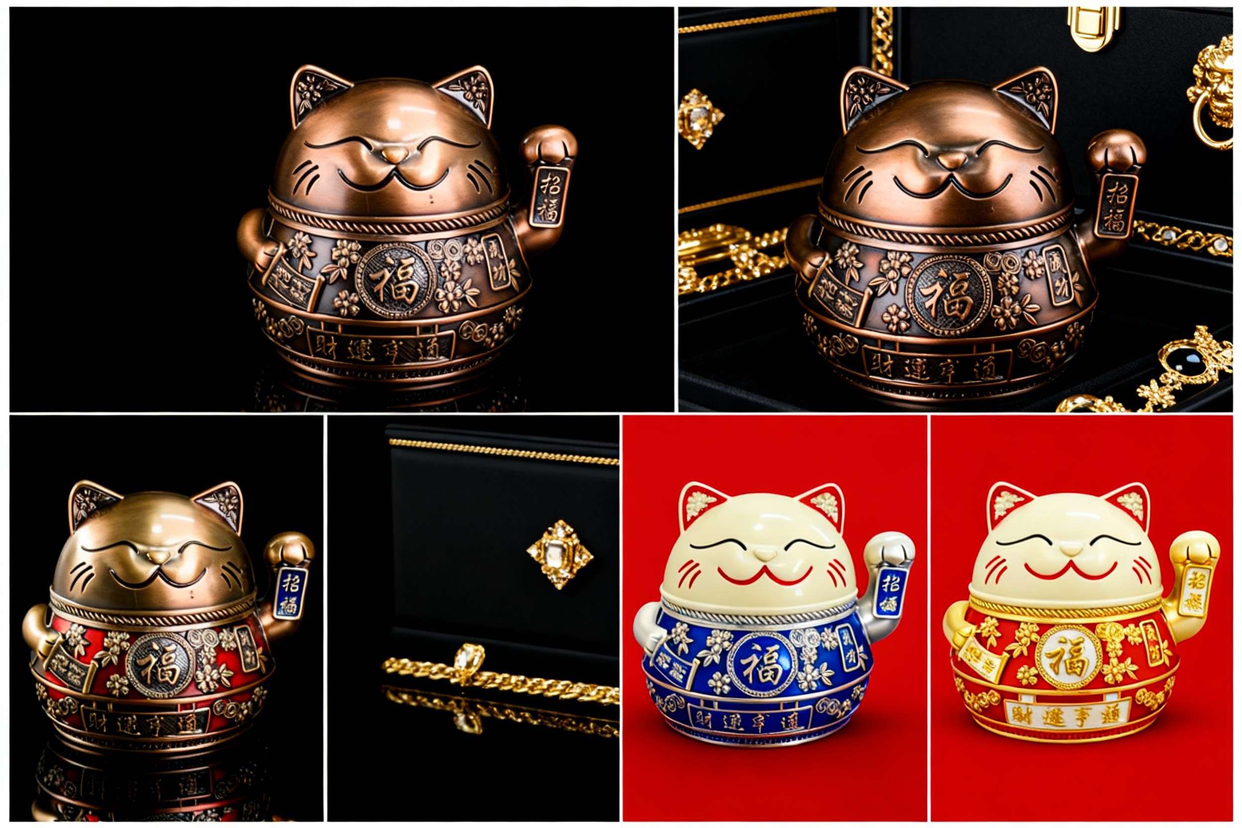 Rich color options: red, gold, bronze, jade blue —